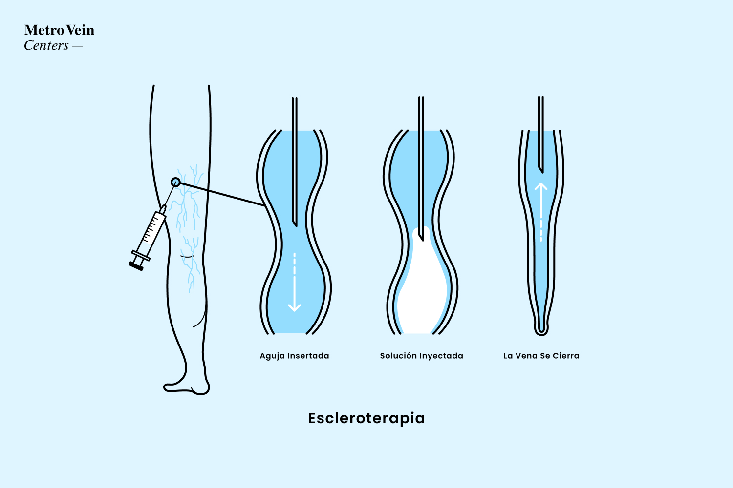 Ofrecemos más que solo la escleroterapia como tratamiento en nuestras clínicas de venas. Nuestros médicos certificados y especialistas en venas se reunirán con usted personalmente para determinar cuáles son sus mejores opciones de tratamiento.